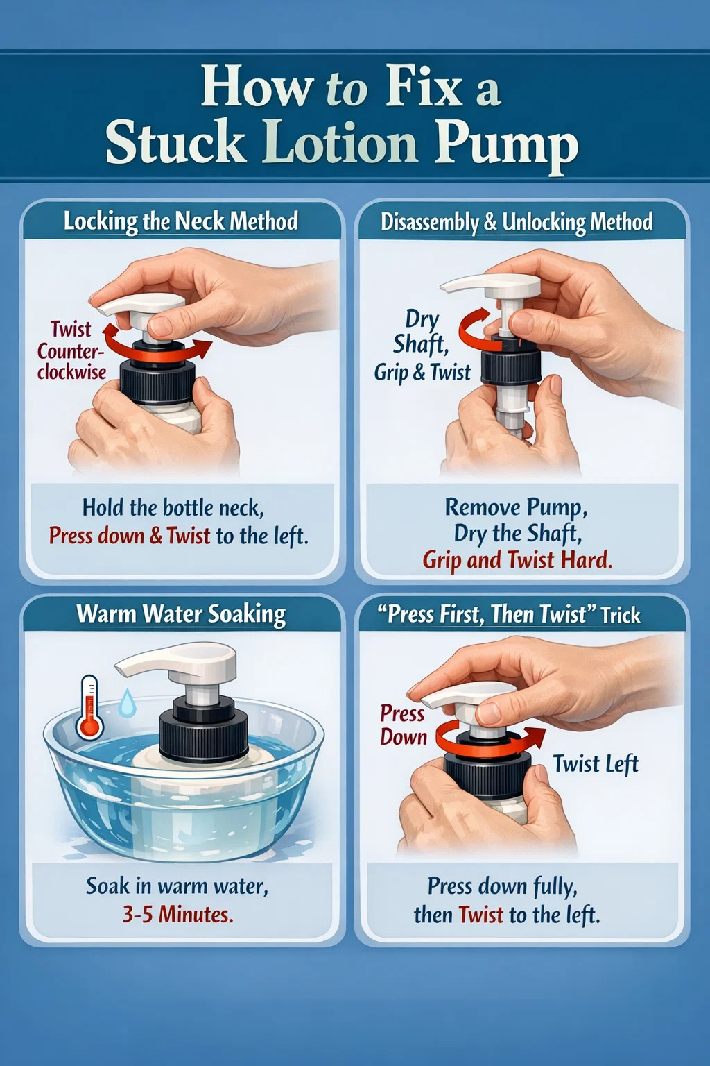 มันค่อนข้างน่าหงุดหงิดเมื่อคุณซื้อใหม่ ปั๊มโลชั่น จะไม่ปรากฏขึ้นไม่ว่าคุณจะบิดมันมากแค่ไหนก็ตาม ซึ่งมักเป็นเพราะกลไกการล็อคภายในแน่นเกินไป หรือคุณหมุนไม่ถูกต้อง