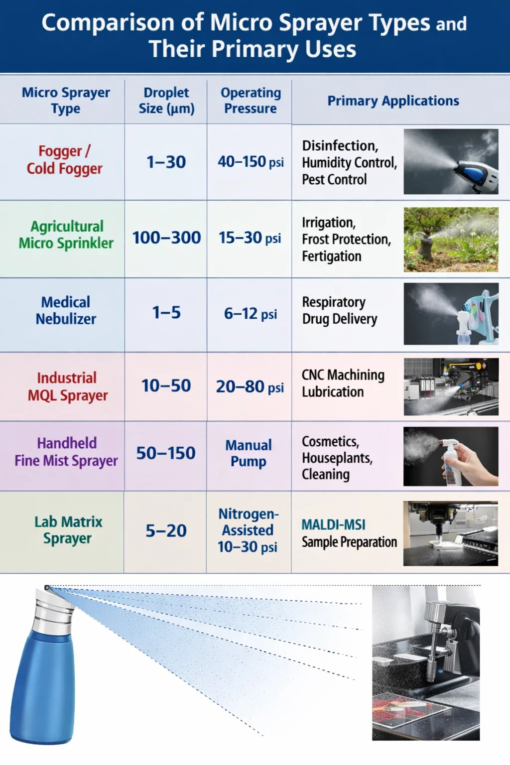 การกำหนดค่าเครื่องพ่นสารเคมีขนาดเล็กที่แตกต่างกันได้รับการปรับปรุงให้เหมาะกับการใช้งานเฉพาะ การเลือกประเภทไม่ถูกต้องส่งผลให้ครอบคลุมได้ไม่ดี วัสดุสิ้นเปลือง หรืออุปกรณ์เสียหาย ตารางด้านล่างสรุปประเภทเครื่องพ่นสารเคมีขนาดเล็กทั่วไป ขนาดหยดโดยทั่วไป แรงดันใช้งาน และกรณีการใช้งานที่ดีที่สุด